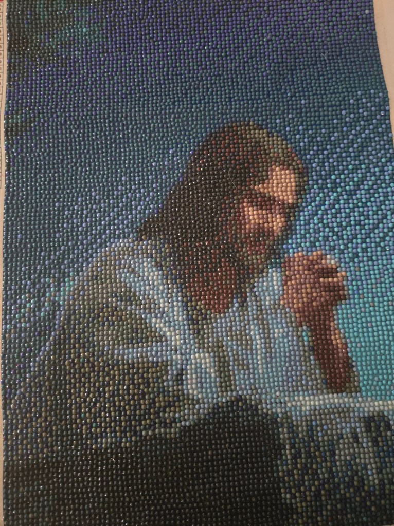 Once I get about halfway up, I turn the paining around and work my way down. It’s definitely more difficult this way, but I don’t want half the paining hanging off the table. This can loosen or misplace the diamonds already done.