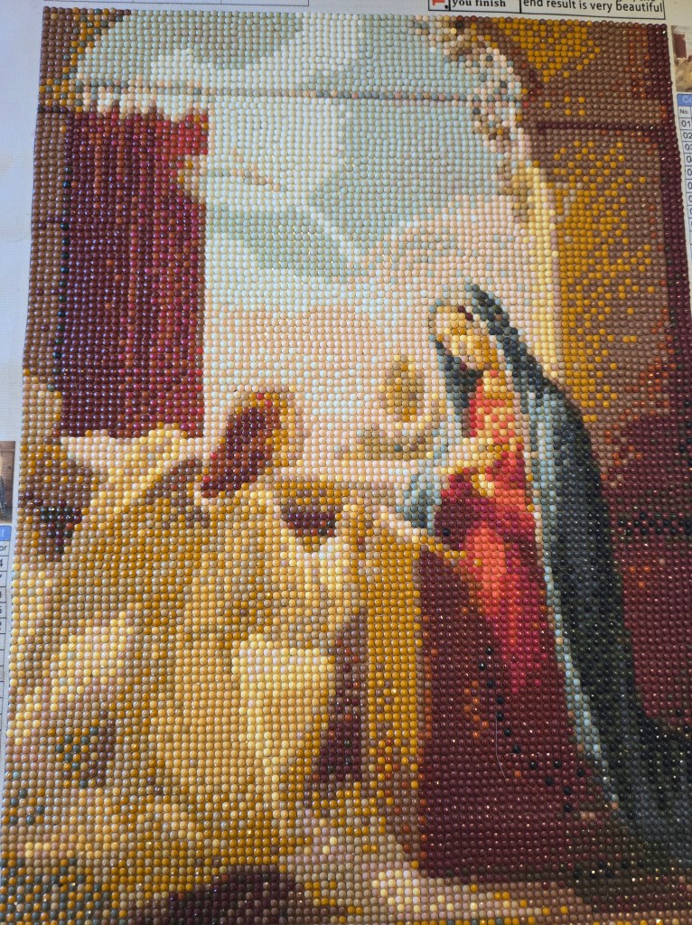 I finished the Annunciation diamond painting this weekend and the Visitation a few weeks back. These were custom designs. My goal is to do one diamond painting for every mystery of the Rosary. Some images are easy and you get a wide choice to pick from such as the Nativity or Resurrection. However, the rest of the Joyful Mysteries were very difficult to come across.